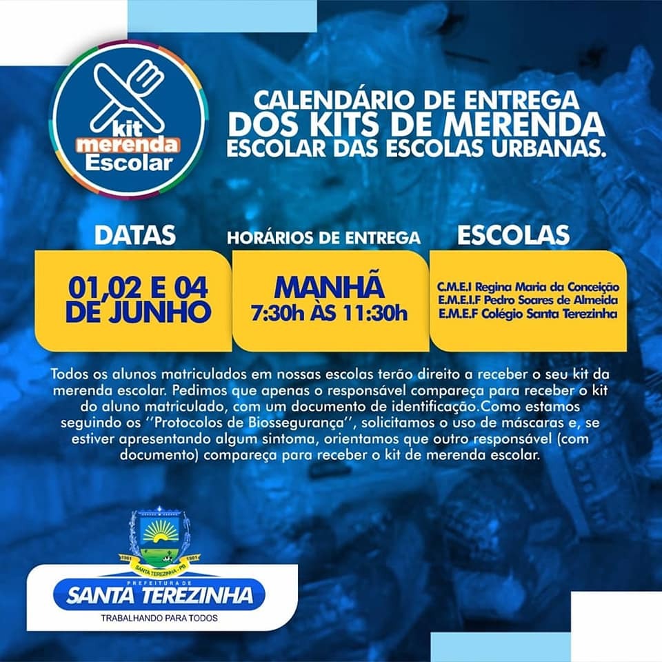 Todos os alunos matriculados em nossas escolas terão direito a receber o seu kit de merenda escolar. Pedimos que apenas o responsável compareça para receber o kit do aluno matriculado, com um documento de identificação.Como estamos seguindo os "Protocolos de Biossegurança", solicitamos o uso da máscara e, se estiver apresentando algum sintoma, orientamos que outro responsável (com documento) compareça para receber o kit de merenda escolar.