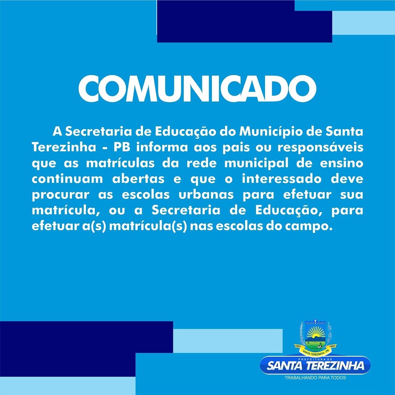 A Secretaria de Educação do Município de Santa Terezinha - PB informa aos pais ou responsáveis que as matrículas da *rede municipal de ensino* continuam abertas e que o interessado deve procurar as *escolas urbanas* para efetuar sua matrícula, ou a Secretaria de Educação, para efetuar a(s) matrícula(s) nas *escolas do campo*.« Voltar