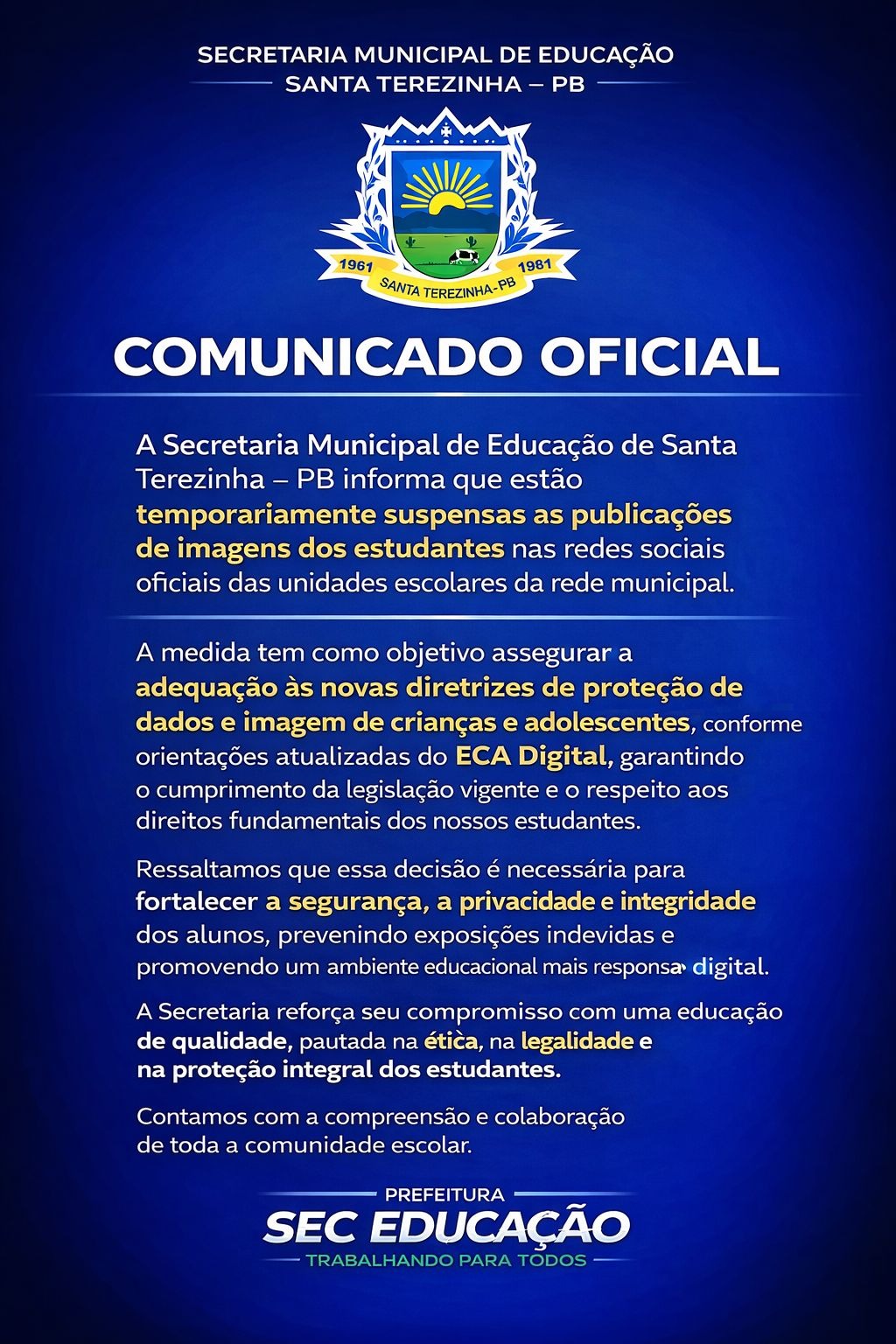 A Secretaria Municipal de Educação de Santa Terezinha – PB informa que estão temporariamente suspensas as publicações de imagens dos estudantes nas redes sociais das unidades escolares da rede municipal.