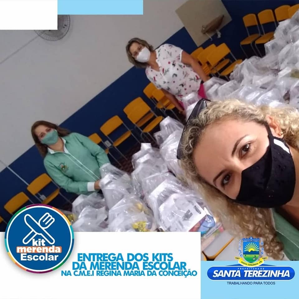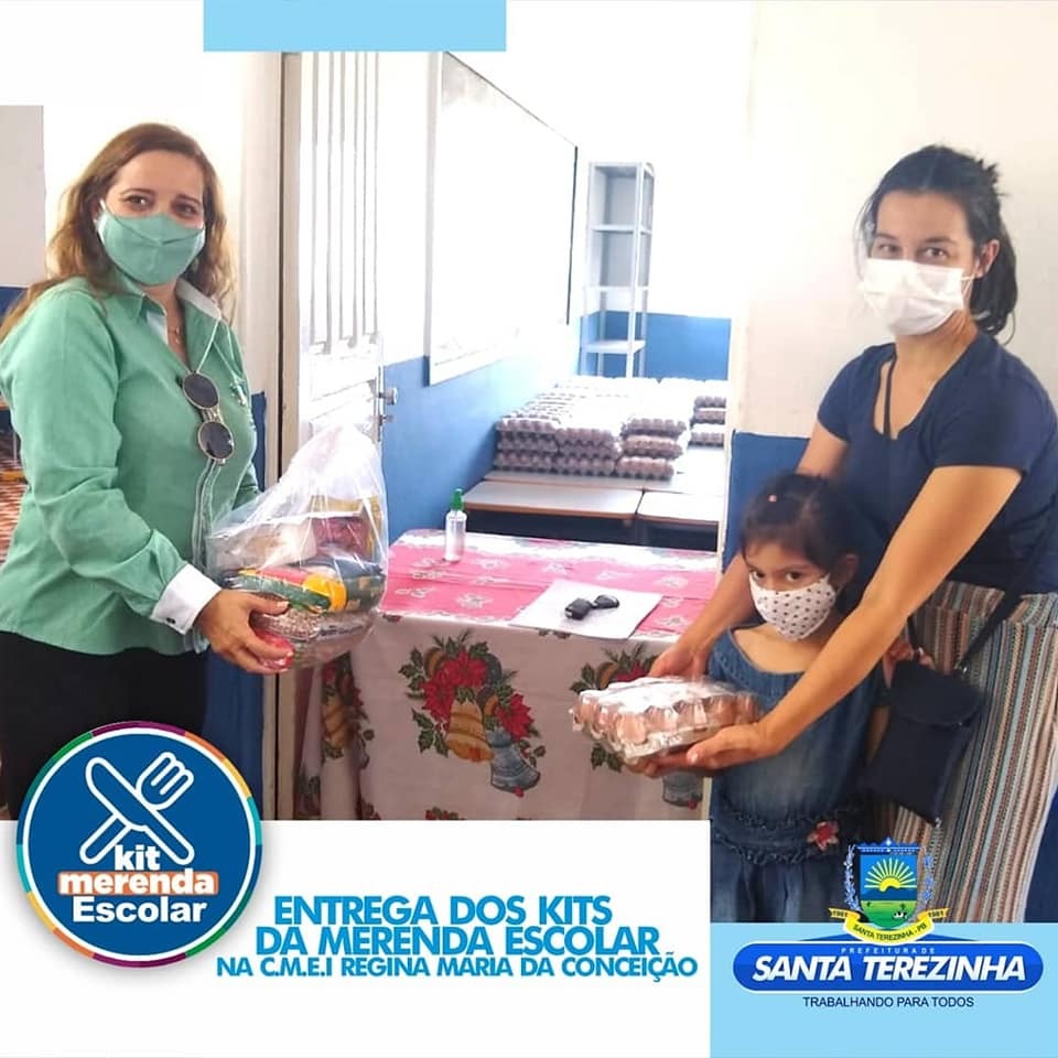 A Prefeitura de Santa Terezinha juntamente com a Secretaria Municipal de Educação realiza a entrega dos kit da merenda escolar aos alunos da rede Municipal de ensino na escola C.M.E.I Regina Maria da Conceição.Cada escola está entregando o kit alimentação aos responsáveis pelos alunos, respeitando as normas para evitar aglomerações. É importante destacar que a merenda sempre foi prioridade na rede municipal de ensino. O objetivo é garantir um complemento para a alimentação dos alunos, uma vez que diante da pandemia da COVID-19.