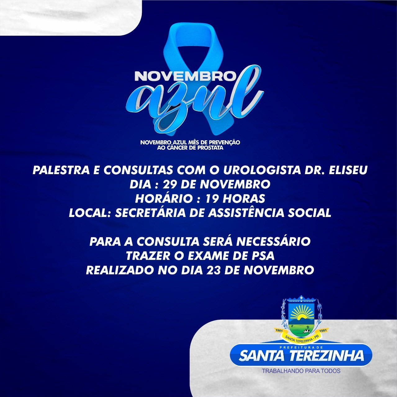 A Secretaria de Saúde de Santa Terezinha vai realizar na próxima segunda-feira (29) a realização de consultas médicas com atendimento especializado na área de urologia. O atendimento será disponibilizado ao público masculino como parte da programação da campanha Novembro Azul de prevenção ao câncer de próstata.