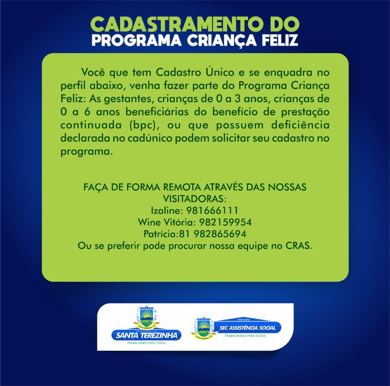 A Prefeitura de Santa Terezinha informa as pessoas cadastradas no Cadùnico que o Cadastramento do Programa Criança Feliz já começou e pode ser realizado de forma remota através das nossas visitadoras pelos números: