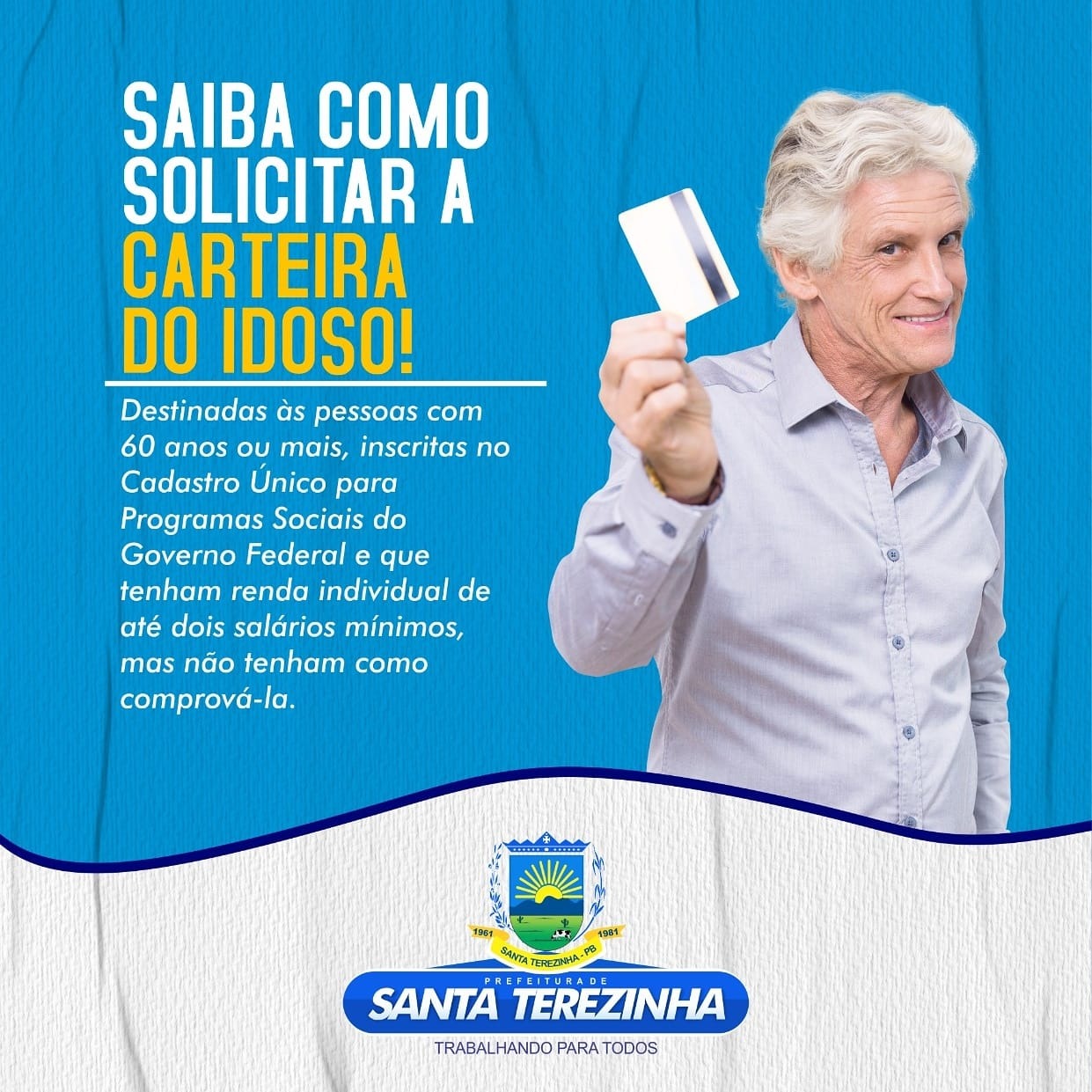 A secretaria de Assistência Social informa aos usuários que já estão emitido a carteira do Idoso no centro de referência de assistência social (CRAS) nos dias segunda, quarta e sexta das 7 as 13 horas Procure fazer a sua. Falar com Rebeca Coordenadora do CRAS.« Voltar