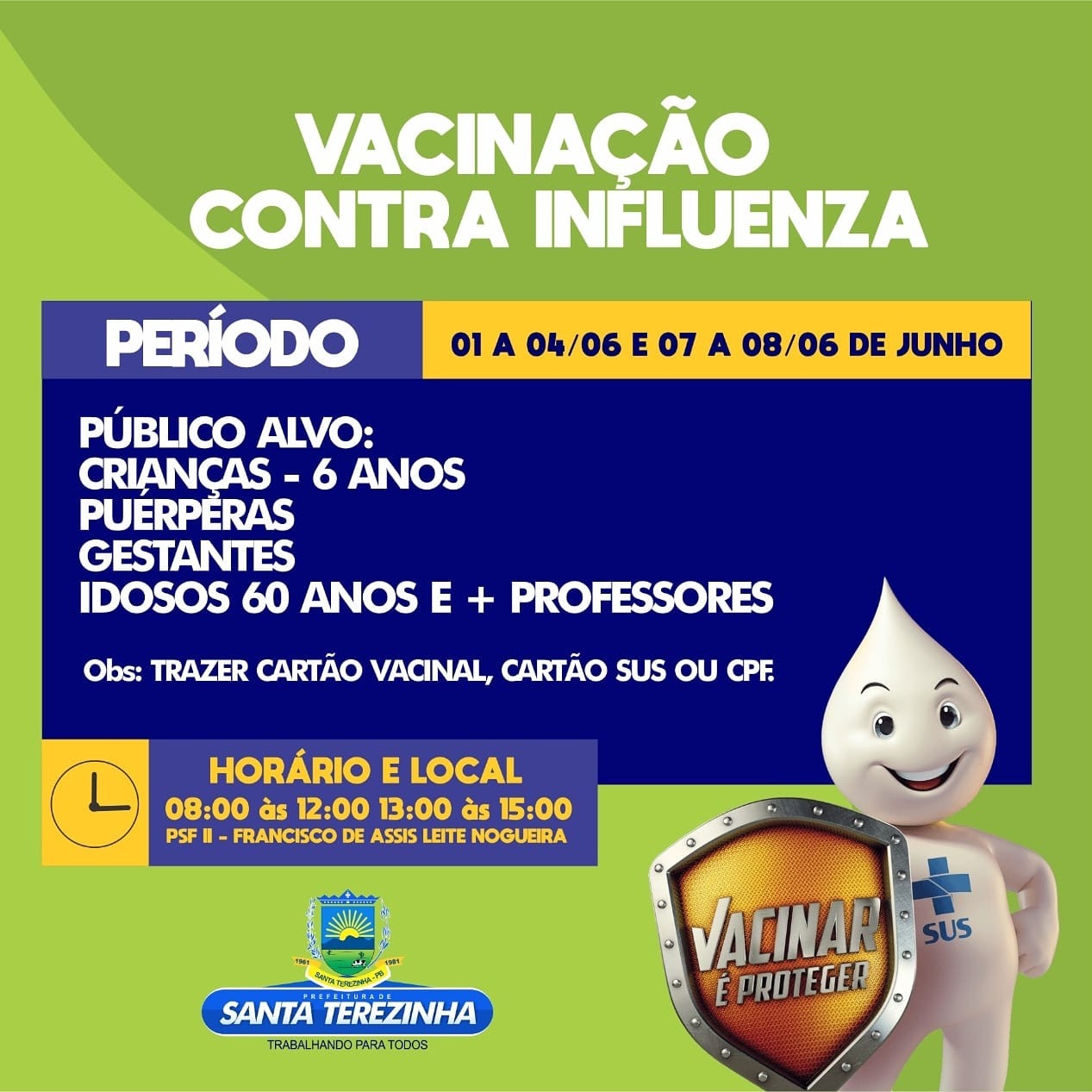 Público Alvo: Crianças - 6 anos / Puérperas / Gestantes / Idosos 60 anos e + / ProfessoresPeríodo: 01 a 04/06
