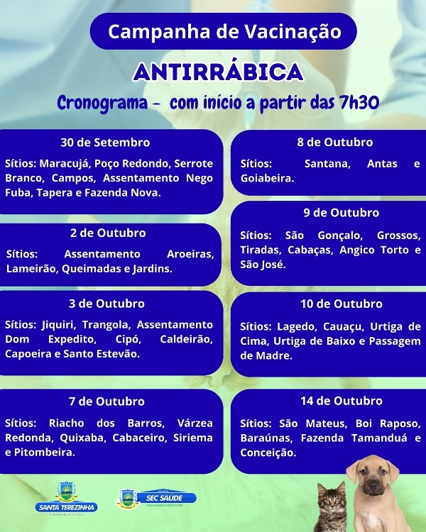 Inicia nesta terça-feira, 30 de Setembro, o cronograma da Campanha de Vacinação Antirrábica na zona rural do município. Os dias de vacinação são: 2, 3, 7, 8, 9, 10 e 14 de Outubro.