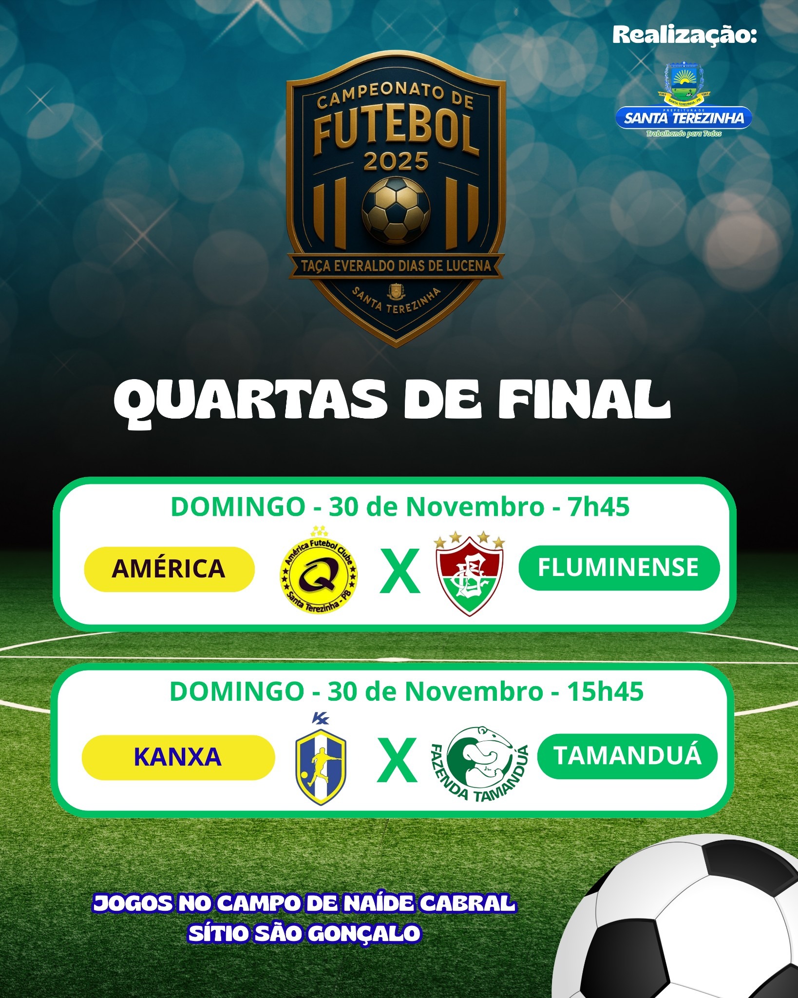 No próximo domingo, 30 de novembro, ocorrerão os jogos das Quartas de Final do Campeonato de Futebol 2025 de Santa Terezinha - Taça Everaldo Dias de Lucena.